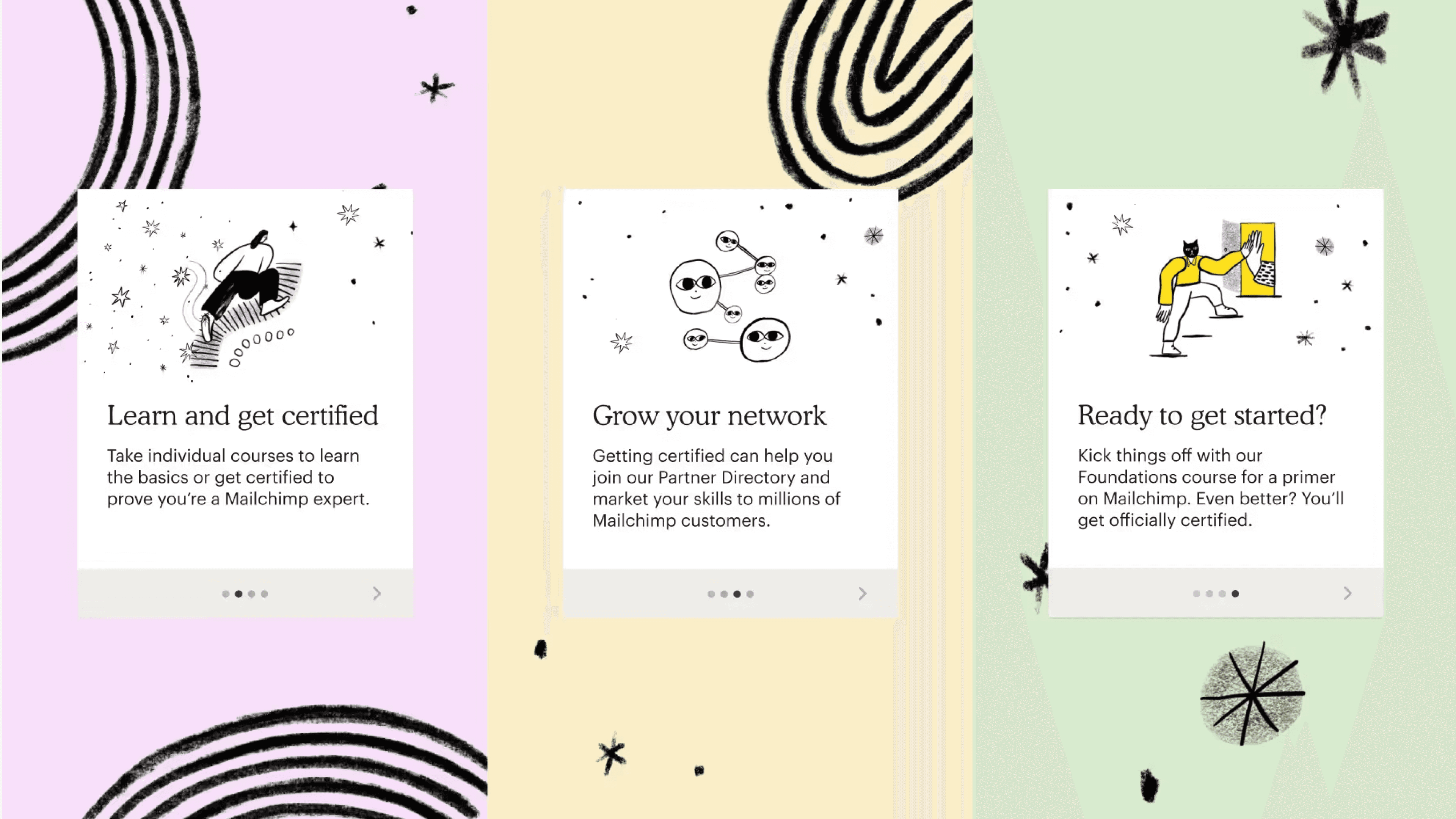 As Lead Product Designer at Beyond, I helped create the MVP for Mailchimp Academy—an online learning hub where users could deepen their skills and earn certification. We designed a learner journey that merged Mailchimp’s standards with user needs, integrating real feedback at every step. Playful interactions, hand-drawn illustrations by yours truly, and approachable UI kept the brand’s personality front and center. Within months of launch, 1,800+ users enrolled, 100+ became certified, and the project earned a Platinum Hermes award.