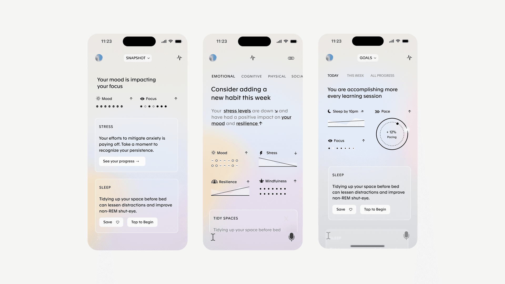 Learning isn’t isolated from how we feel. We built in gentle cues that reflected a user’s energy, focus, and emotional state—supporting them through high-energy moments and offering permission to rest when needed. These ambient signals were never punitive; instead, they created a sense of psychological safety and helped learners understand how their mood affected their momentum.
