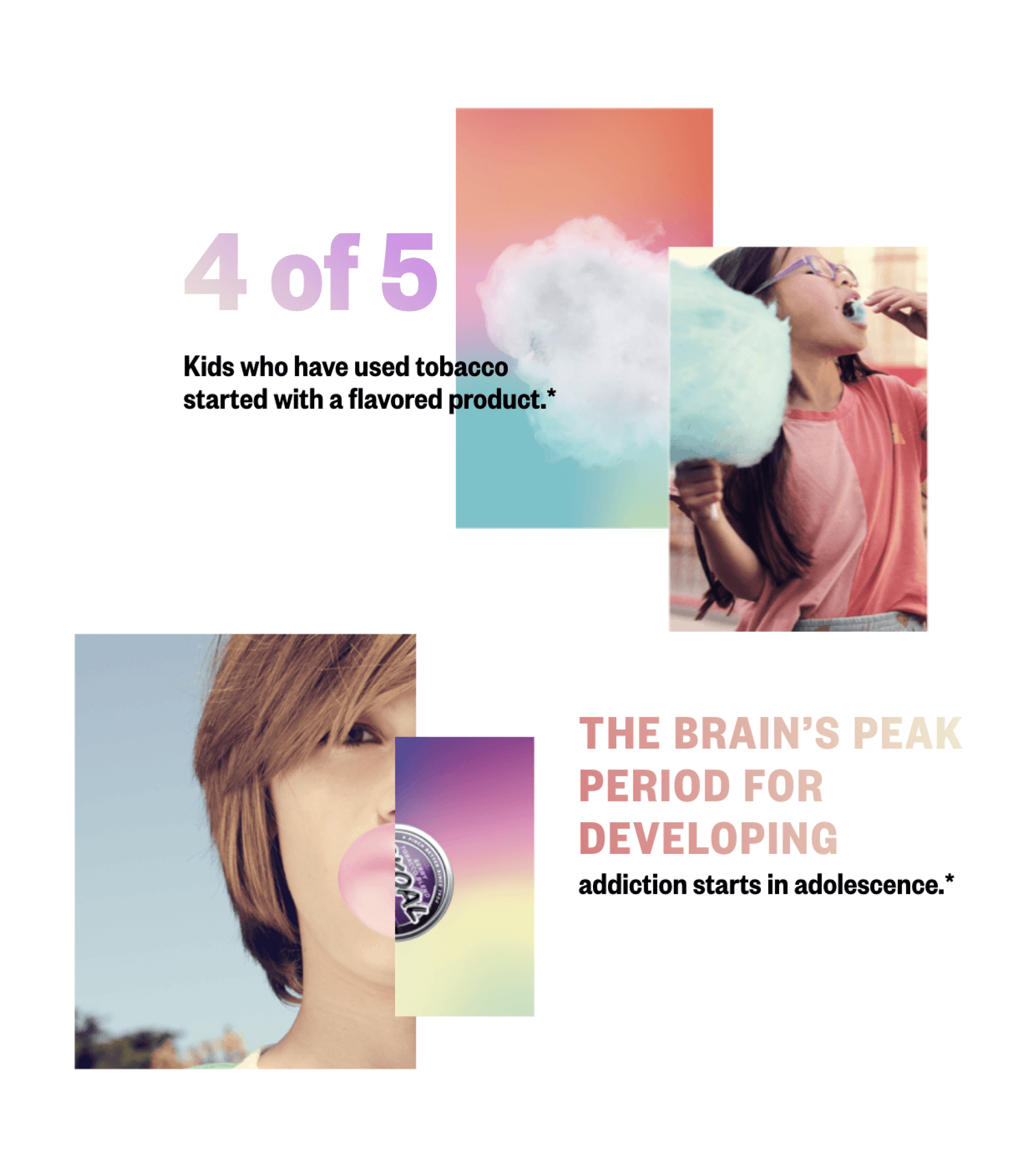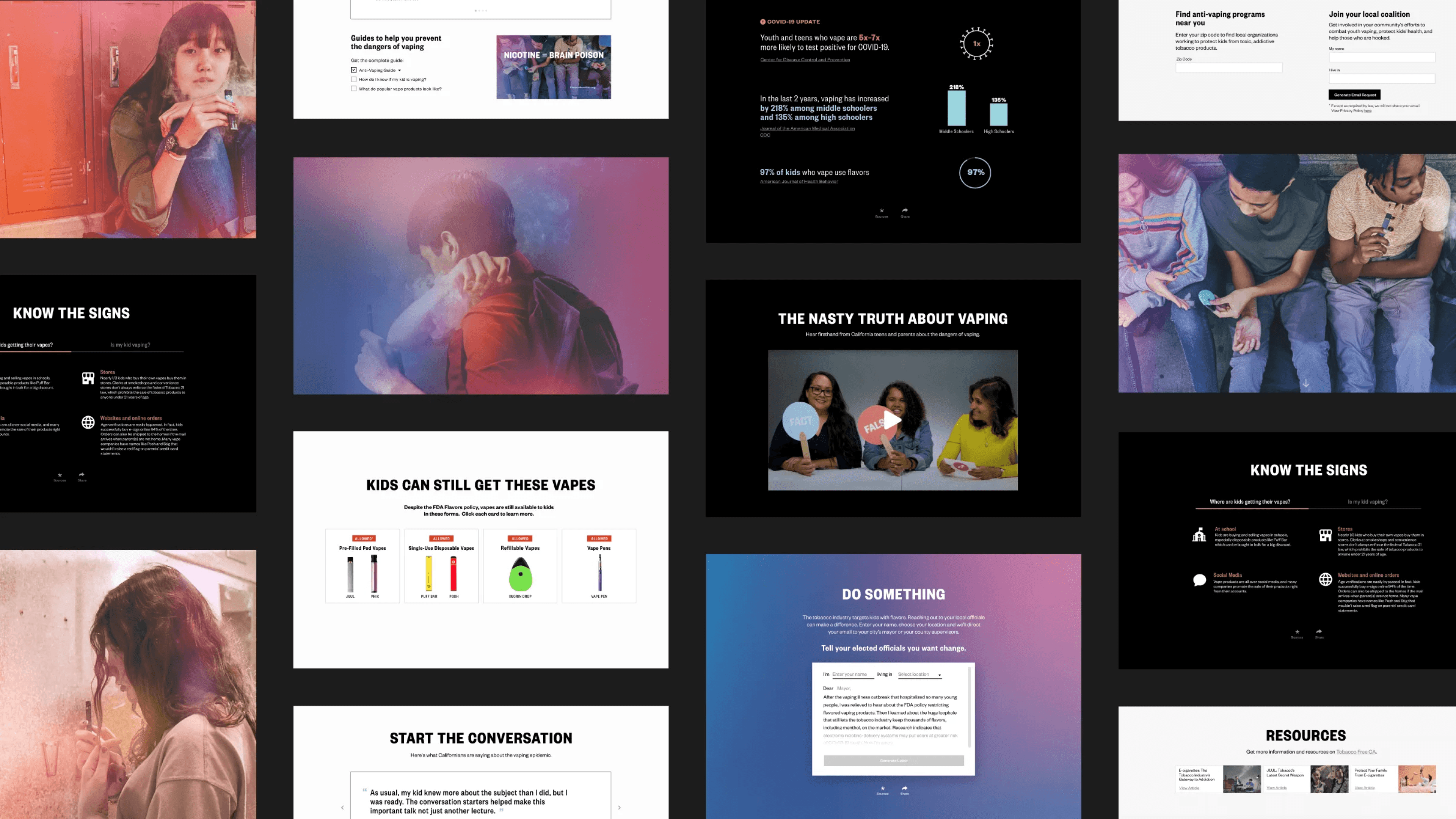 A high-impact advocacy site created to educate parents on the dangers of flavored nicotine. The experience balanced credibility with urgency—making it easy to understand the stakes and take action. The campaign reached 1.75 million sessions and helped fuel e-cigarette bans across the U.S., showing how design can directly influence policy.