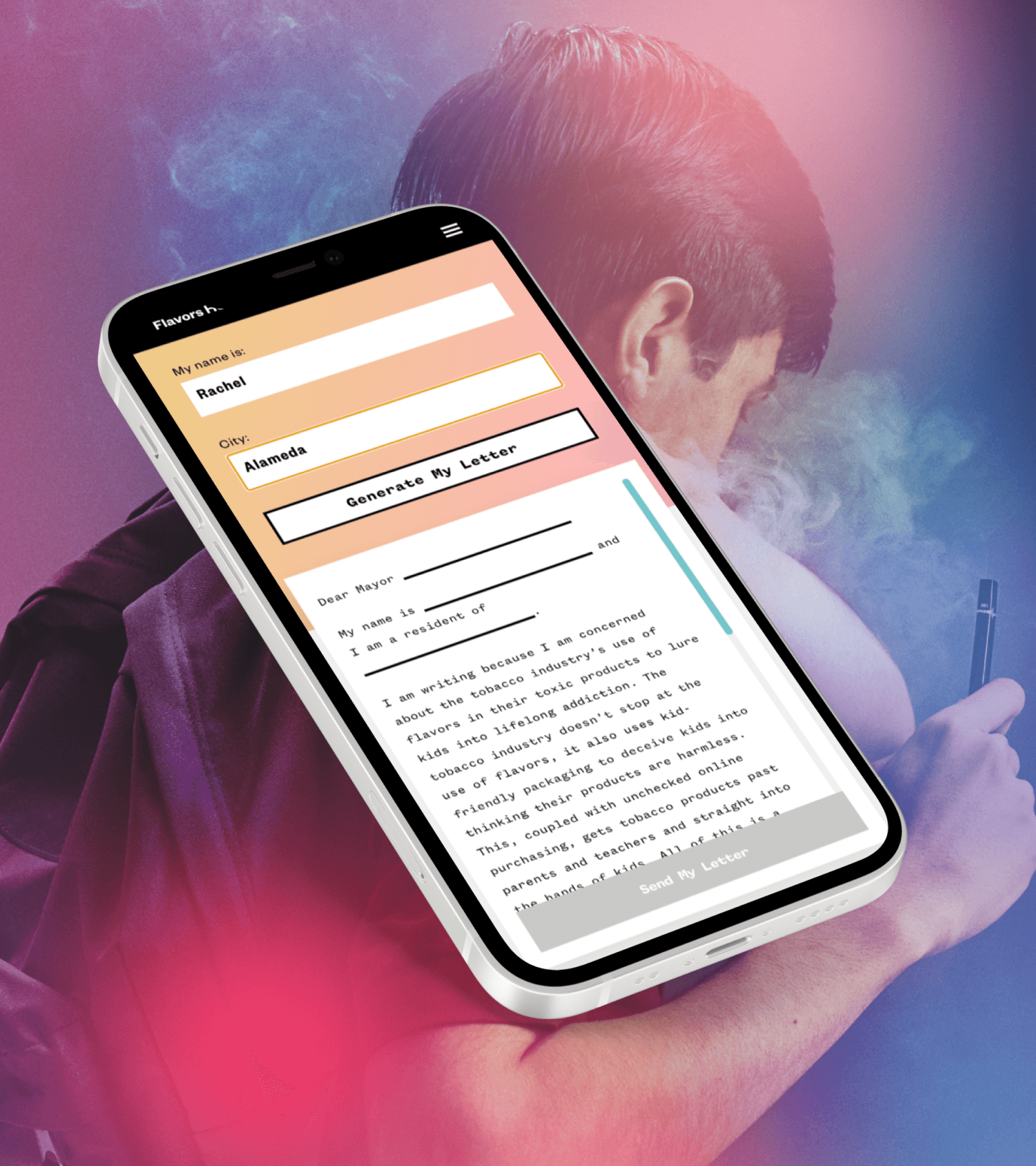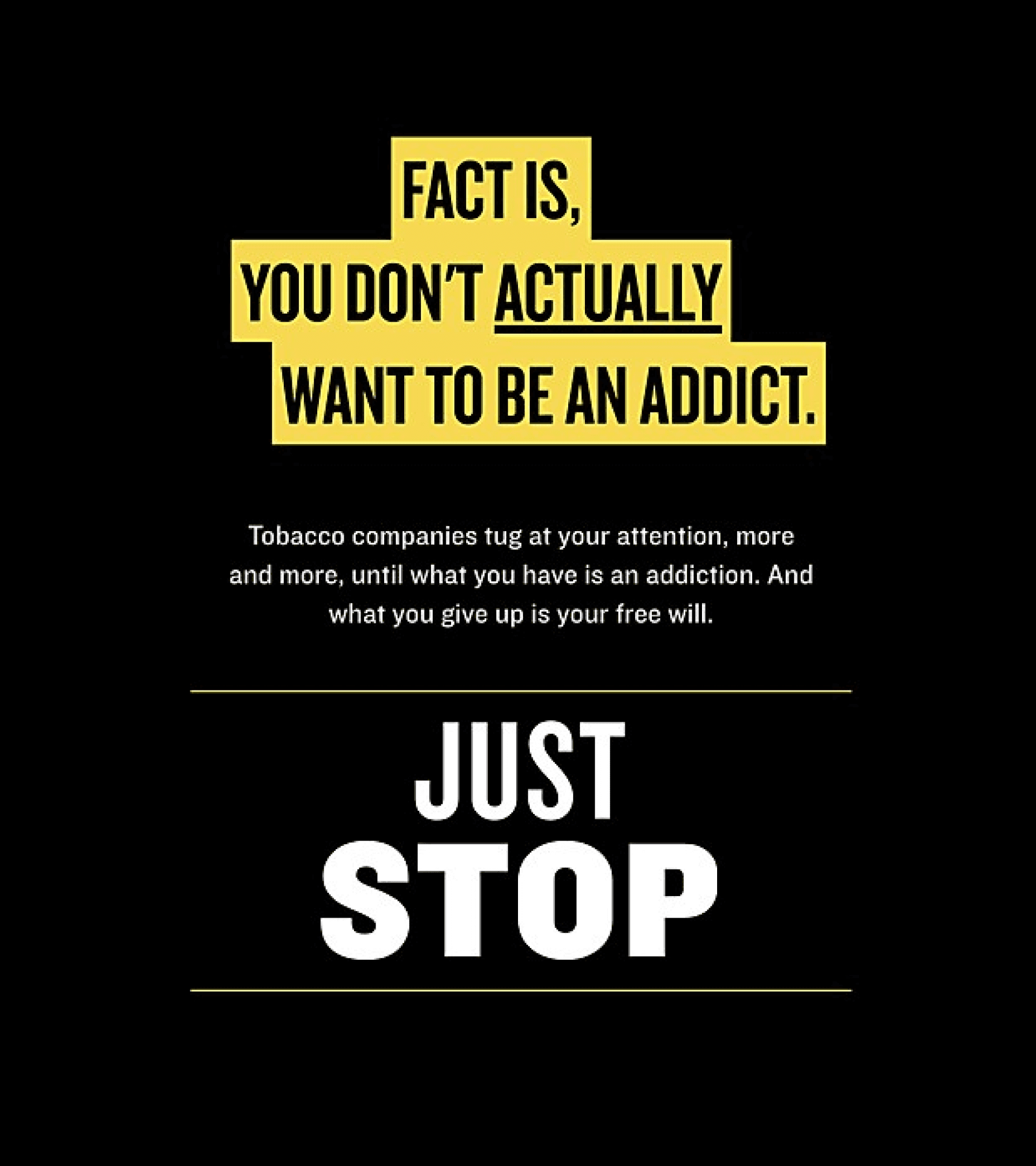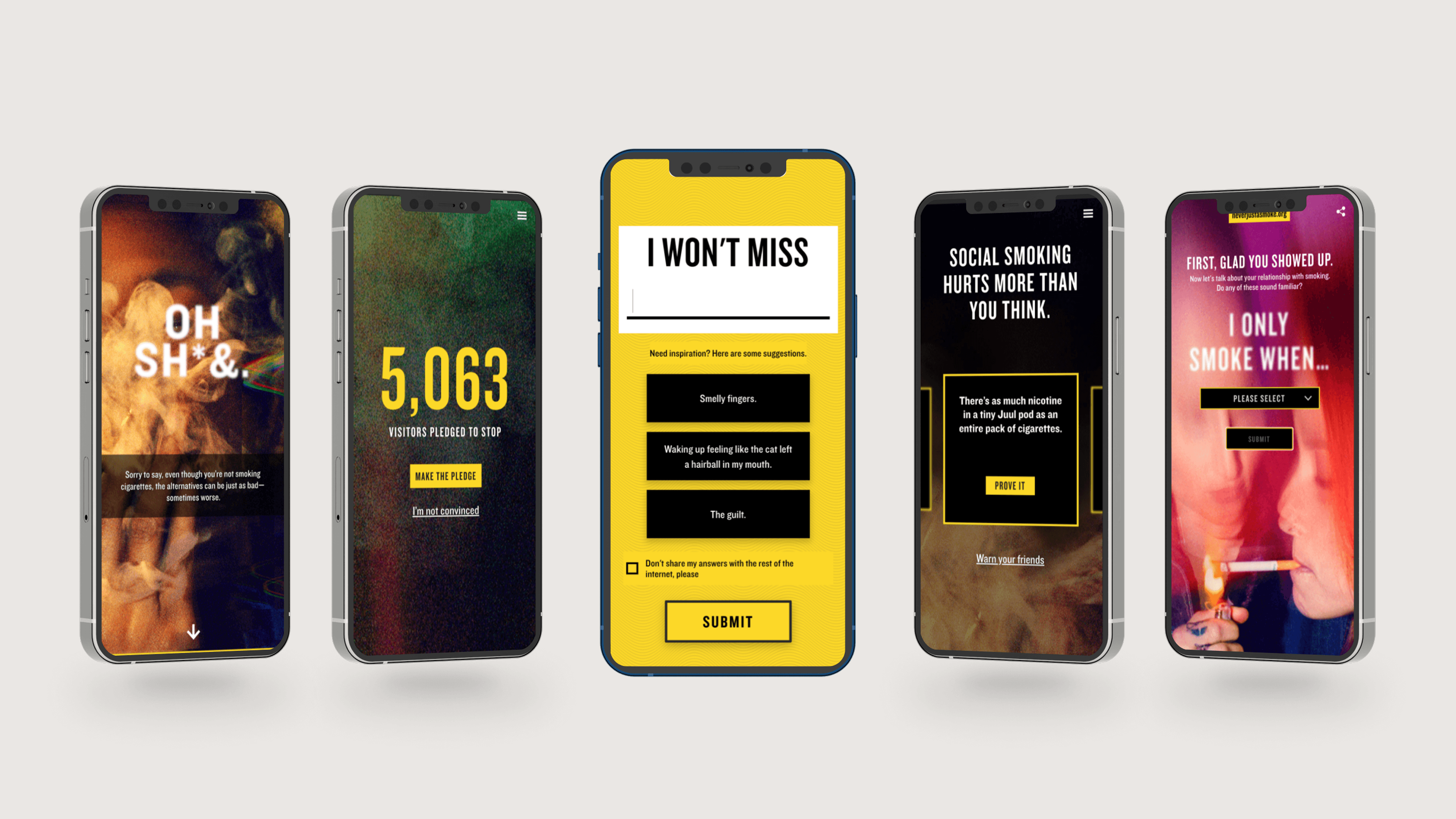 A mobile-first site targeting young social smokers, designed to feel conversational and peer-to-peer rather than preachy. Interactive elements and stylized visuals kept the tone engaging, while carefully crafted content reframed casual smoking as a real health risk. The approach met young people in their digital spaces, turning small shifts in perception into lasting behavior change.